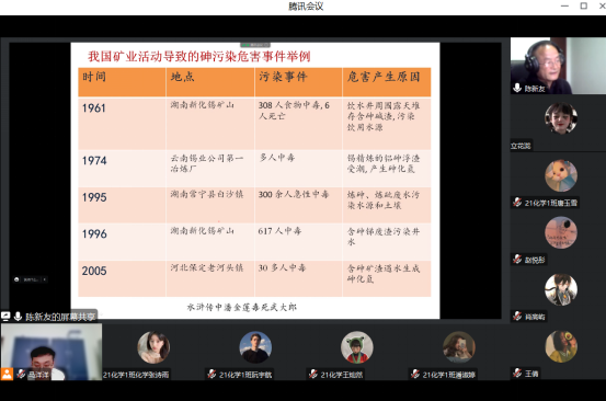 陈老师结合自己的教学实践和科研方向,从砷的自然存在与砷暴露,砷对人类健康的影响,砷的生物效应与作用机理等方面给同学们讲述了砷的化员工物学特性。讲述了砷在自然界的分布、转化与转移过程中,自然力量、人类活动、微生物、植物等因素的作用机制。从化学的底层逻辑出发,深入浅出地阐述了砷的高生物毒性与高生物活性、砷化物的致病与治病、毒药与医药,这些看似矛盾实际有着内在本质联系的问题。提高了同学们对学科交叉的认识,激发了同学们对各自专业的学习兴趣。增强了同学们在专业学习过程中运用辩证唯物主义世界观和方法论,一分为二看问题的自觉性。