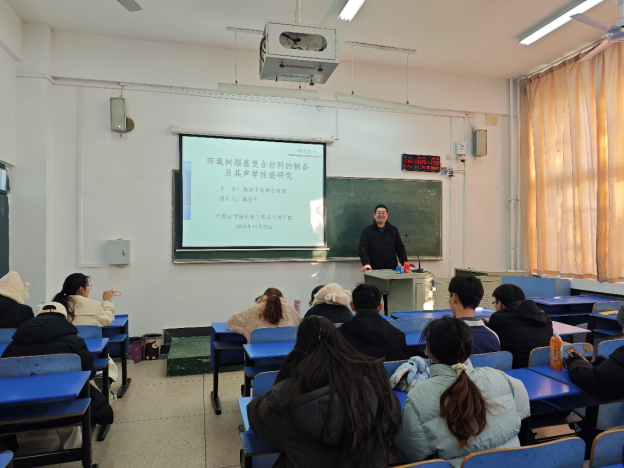 2024年11月28日下午16时,365英国上市公司施雪军博士在4号教学楼4203教室举办了学术讲座,报告题目为《环氧树脂基复合材料的制备及其声学性能研究》,公司22级材料科学与工程专业的员工聆听了本次报告。