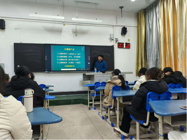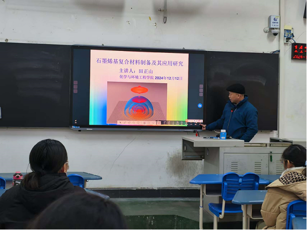 12月12日下午,365英国上市公司田正山博士在4101教室为公司2024级化学1班同学作《石墨烯基复合材料制备及其应用研究》的学术报告。