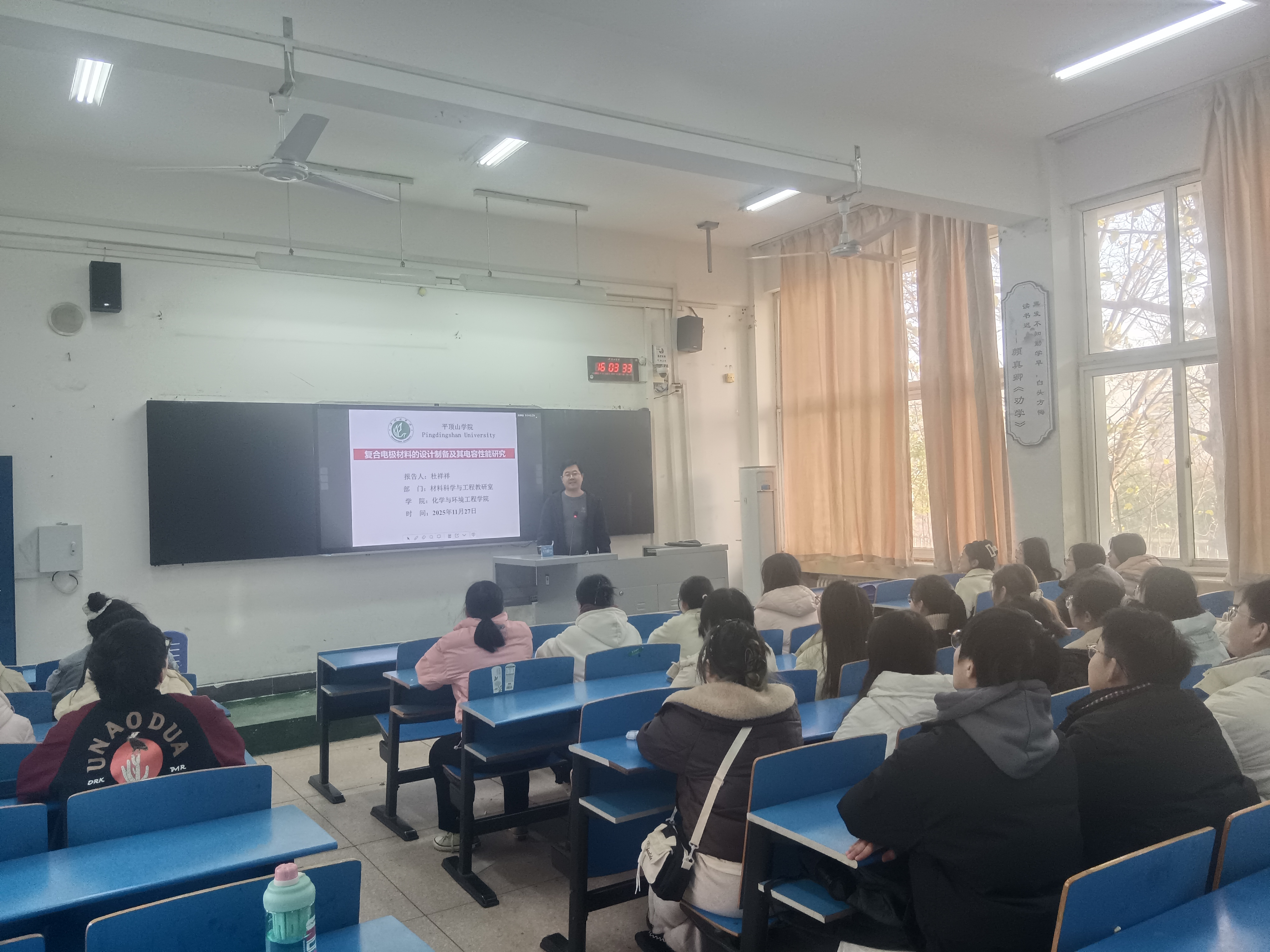 2025年11月27日下午16时,365英国上市公司杜祥祥博士在4号教学楼4104教室举办了学术讲座,报告题目为《复合电极材料的设计制备及其电容性能研究》,我院23级材料科学与工程专业的员工聆听了本次报告。