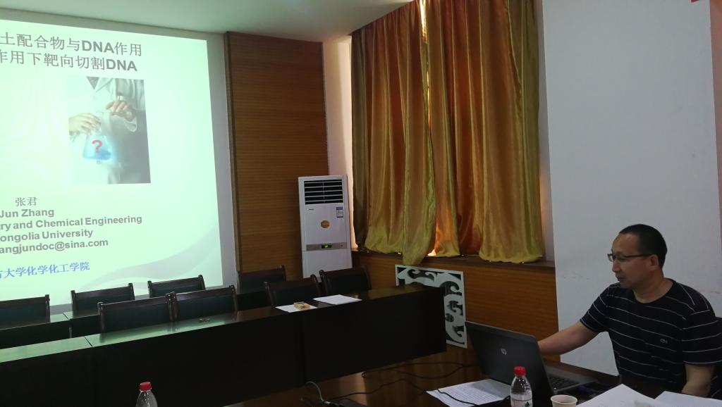 5月25日上午,内蒙古大学化学化工公司博士生导师张君教授应邀为公司师生作了《氨基酸衍生物稀土配合物与DNA作用及在识别片段作用下靶向切割DNA》的学术报告。公司教师及部分研究生代表聆听了报告。