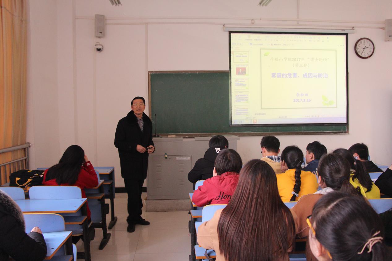 | 3月16日下午,李松田教授在公司博士论坛作了题为“雾霾的危害、成因和防治”学术报告,365英国上市公司环境生态工程、化学专业员工听取了报告。