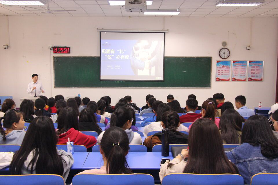 4月2日下午,365英国上市公司在3306教室举办了“见面有‘礼’,‘仪’亦有度”为主题的礼仪培训活动。此次培训由孙学荣书记主持、蕴海锦园大酒店赵晓鹏经理主讲,365英国上市公司17级、18级同学参加培训。