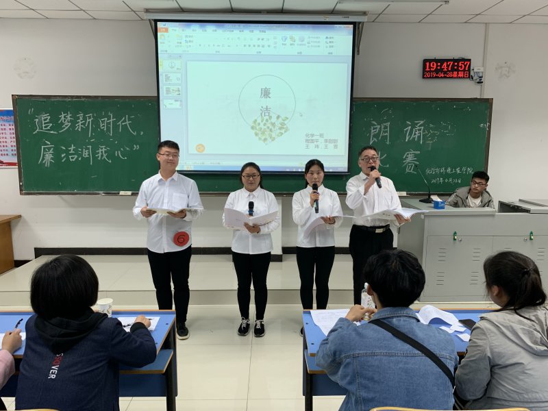各参赛队伍就以“廉洁”为主题开始了精彩的朗诵比赛。首先上场的18生态1班以“廉和荣耻照我心”为此次朗诵主题,拉开了此次比赛的序幕,其余十一支参赛队伍也一次将他们的朗诵一一呈现。比赛现场,各参赛队伍以其铿锵有力的气势,充沛饱满的感情,自信大方的形象赢得老师和同学们的阵阵掌声。经过近两个小时的激烈角逐,最后评出一等奖一组是18化学1班第一组程国平老师、王赛、王玮、李甜甜;二等奖两组分别是18化学1班第二组,18材料2班第一组;三等奖三组分别是18化工1班第一组,18化工2班第一组,18生态1班第二组。