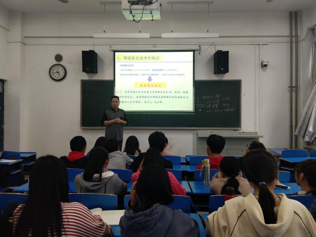 随后,程国斌老师向同学们讲解了催化O3氧化技术在工业废水处理及资源化应用研究。他向同学们讲解了高级氧化技术的概括和分类,并介绍了催化O3氧化技术在工业废水资源化应用和目前公司在这方面的研究。报告会中,同学们积极与老师进行交流,现场学习氛围浓厚。