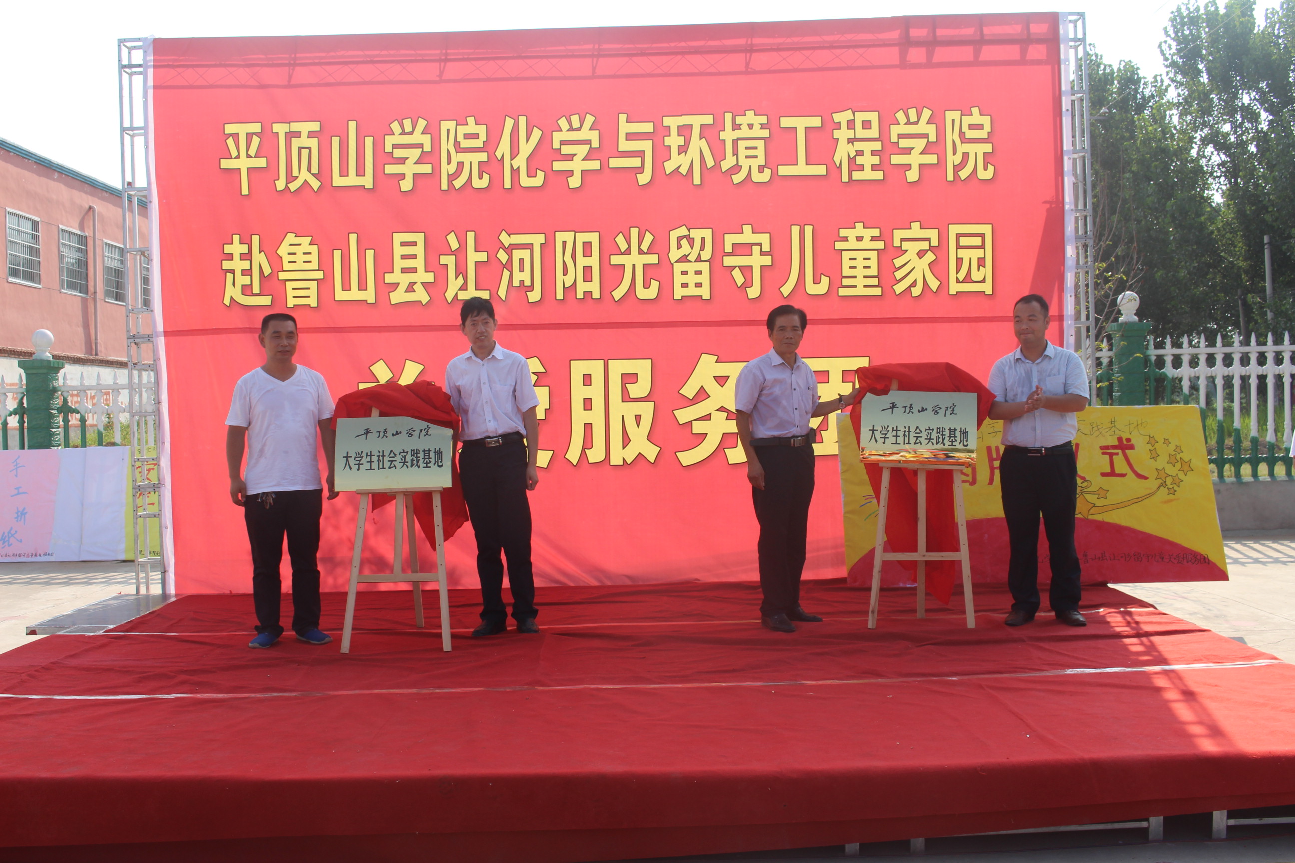 7月12日下午,公司“老员工社会实践基地”揭牌仪式在鲁山县让河乡阳光留守儿童家园隆重举行。校团委书记赵伟杰、校团委副书记王刘涛,公司党总支书记李青彬、党总支副书记孙学荣,让河乡第五小学董事长张亚鹏、阳光留守家园总经理沈玉丙、园长张顺民及带队老师马国杰出席了本次揭牌仪式。一起参与的还有42位志愿者和全体员工。