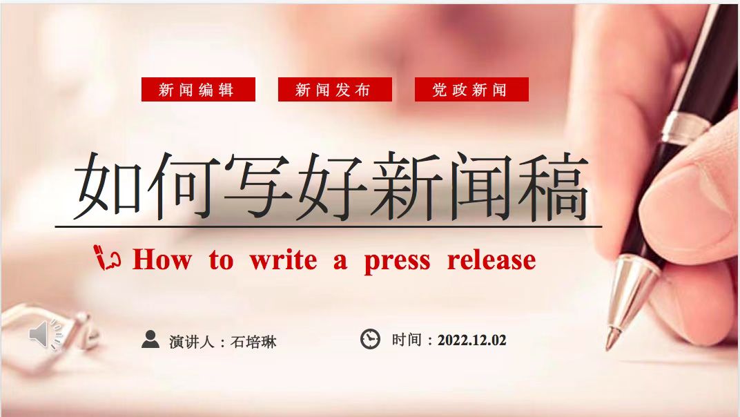 会议伊始,石培琳老师就如何写好新闻稿这个问题展开讲解。之后,石培琳老师从校园新闻的种类开始讲起,细致的为大家讲述了校园新闻的基本特征和写作技巧。她以丰富的新闻写作经验,向同学们展示了校园新闻稿中常见的问题,如标题主旨不明、新闻内容口语化等,并一一列举说明如何解决这些问题。石培琳老师强调,想要写好新闻稿,就要多写多练,在提高自身文学修养和写作能力上下功夫,最后,石培琳老师建议大家要善用网络搜索,多阅读校园网新闻,反复练习来提高新闻写作能力。培训期间,与会人员认真听讲,对重点知识做好详细记录,同学们都表示通过培训学到了很多实用的新闻稿写作技巧,受益匪浅。