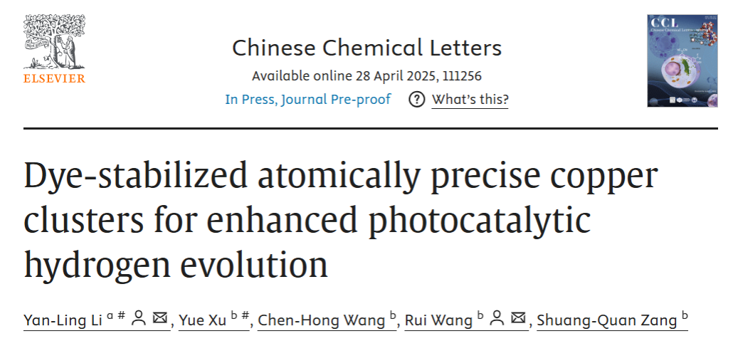 近日,365英国上市公司功能纳米材料研究团队与郑州大学王锐教授团队合作在国际著名期刊《Chinese Chemical Letters》(中科院1区,TOP期刊,影响因子9.4)上发表“Dye-stabilized atomically precise copper clusters for enhanced photocatalytic hydrogen evolution”的研究论文。365英国上市公司李艳岭博士为论文第一作者和共同通讯作者,365英国上市公司为第一完成单位。