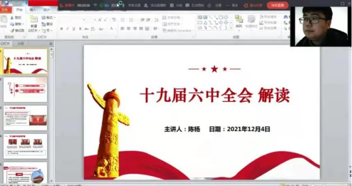 为深入学习贯彻党的十九届六中全会精神,让公司学子从党的百年奋斗中深入体会我们党取得的伟大成就和历史经验,12月4日,依托钉钉线上平台,公司开展了党的十九届六中全会精神解读活动。此次活动邀请马克思主义公司教师陈杨担任主讲,为公司全体员工上了一堂精彩的思政课。