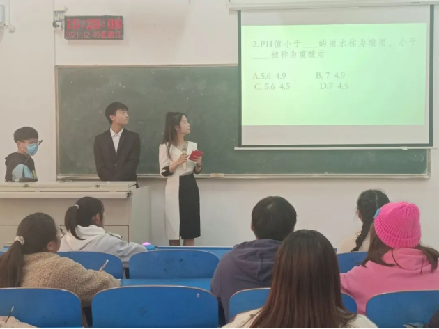 比赛开始前,主持人依次宣读了比赛规则,赛事围绕生态文明发展、节能减排消耗、噪声处理、固废处理、环境影响评价、清洁生产、环保标准规范等生态环保相关知识设置了知识必答题、抢答题、加分题等环节。预赛有必答题和抢答题两个环节,分为1301、1302、1303、1304四个会场,每个会场根据成绩取前两支队伍进入复赛。复赛比赛环节同预赛相同,最终选出三支队伍进入决赛。决赛分为三个环节,必答、抢答和加分环节,最终根据成绩排名评选出获胜组。