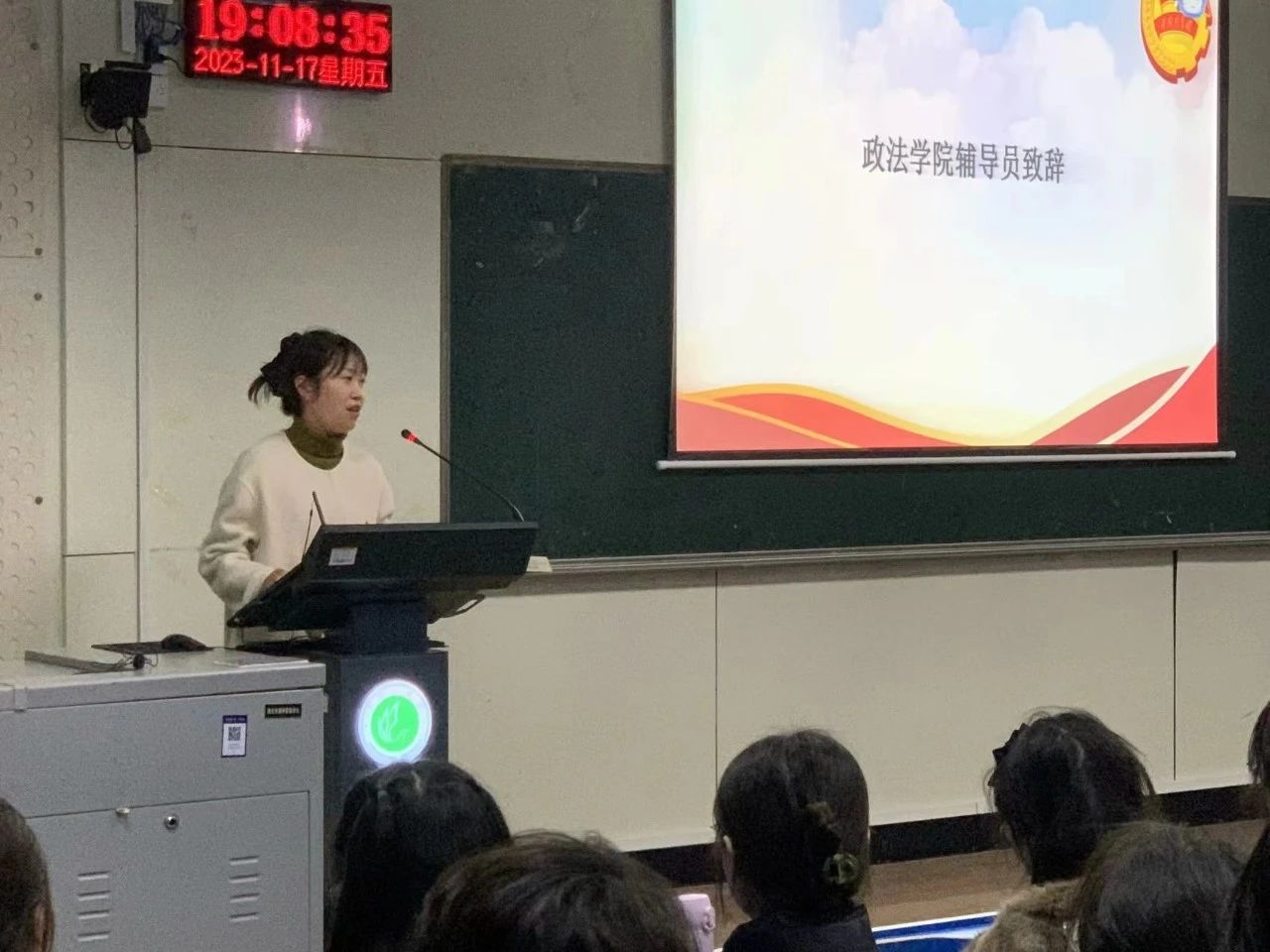 仪式第四项,政法公司22级辅导员刘盈君致辞。她勉励全体学员明确开展团课的目的,端正入团动机和入党动机,树立正确的理想信念。同时要端正学习态度,珍惜宝贵的学习机会,不仅要在思想上积极向共青团靠拢,更要在行动有所表现,做一名优秀的共青团员。最后,刘盈君老师祝愿全体学员在团校培训学习中能够取得进步与成长,并顺利结业。