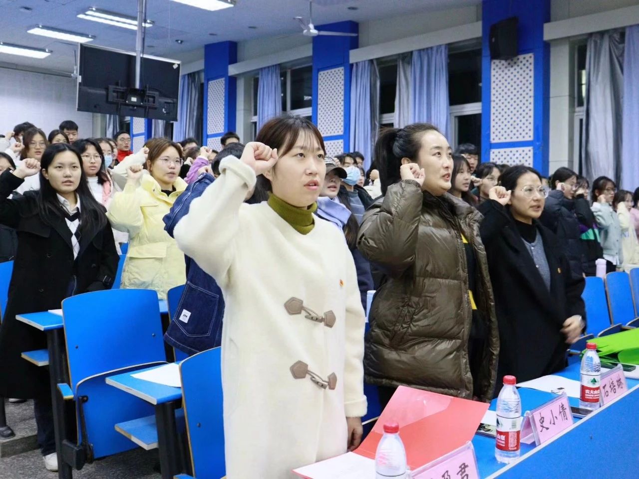 仪式第二项,齐唱团歌。全体起立,合唱团歌,在庄严的团歌声中,开班仪式正式拉开序幕。
