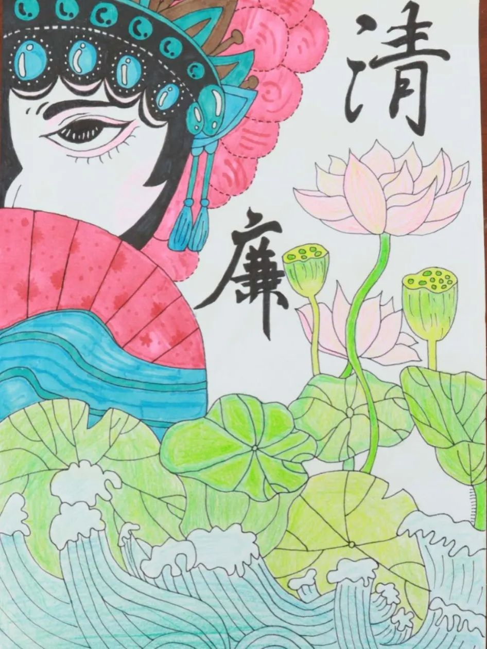 “绘廉”篇以画笔轻舞廉洁的斑斓画卷。同学们用色彩和线条描绘出了一幅幅廉洁的场景,体现了廉洁文化在社会生活中的广泛影响,传递了共建共享、廉洁自律的理念。这些画作不仅展示了师生们的艺术才华,更通过生动形象的画面,向人们传递了廉洁文化的深刻内涵。